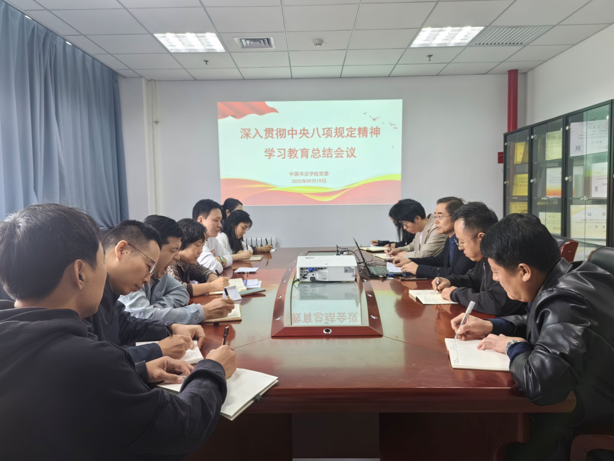 9月19日,中国书法学院党委组织召开深入贯彻中央八项规定精神学习教育总结会。会议传达学习习近平总书记关于学习教育的重要指示和中央党的建设工作领导小组会议精神,系统总结学院学习教育成效与经验,对下一步巩固拓展学习教育成果、推动作风建设常态化长效化作出具体安排部署。学院党委书记王若鸿主持会议并作总结讲话,院党委委员、支部书记及全体党员教师参加会议。