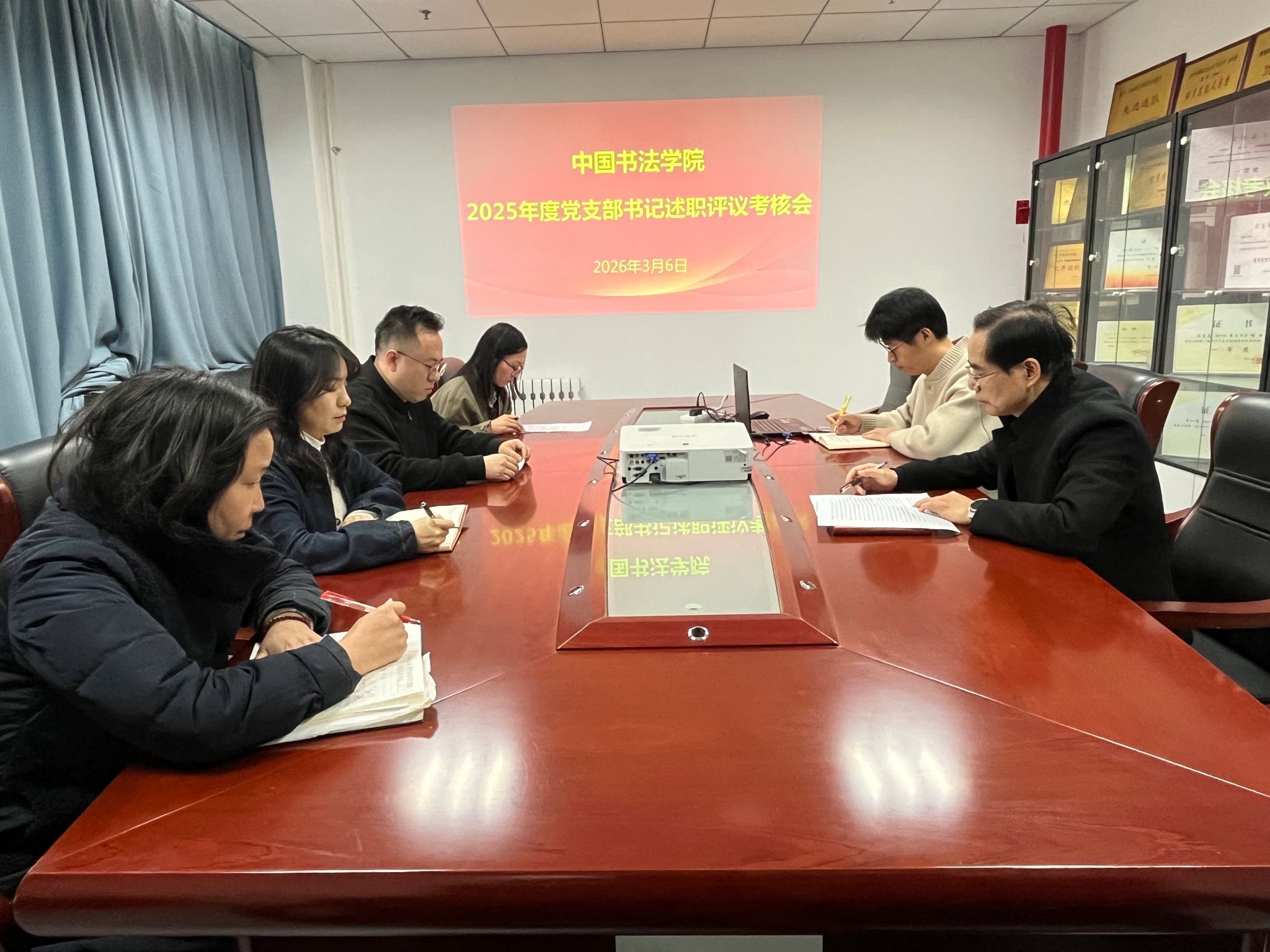 为扎实推进基层党建工作提质增效,强化党支部书记履职尽责意识,3月6日,中国书法学院在9-406会议室召开2025年度党支部书记述职评议考核会。学院班子成员、党委委员、党支部书记参加会议,会议由学院党委副书记王若鸿主持。