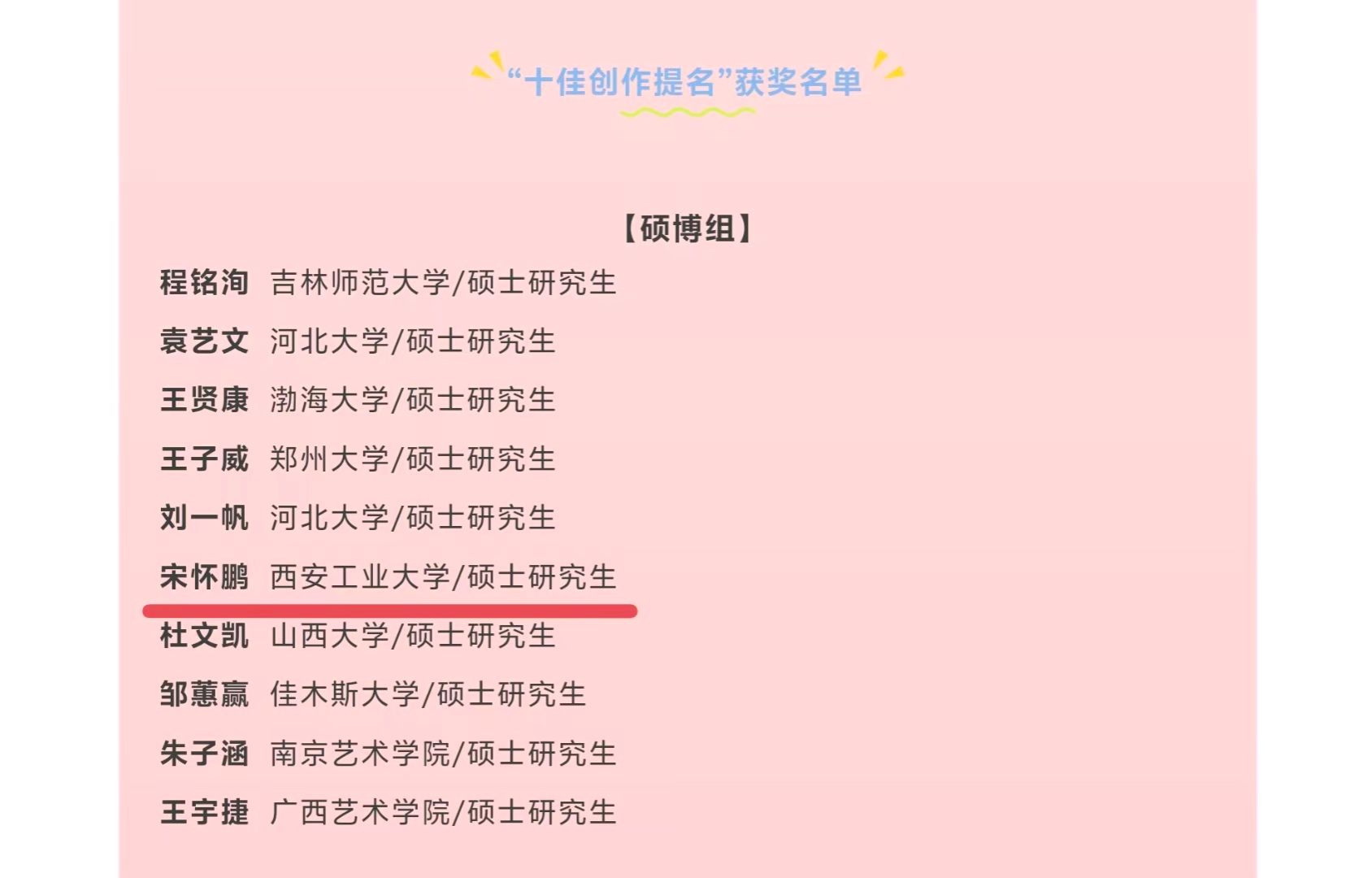 近日,由郑州大学《大学书法》杂志举办的2025年度全国大学生“十佳创作奖”“十佳学术奖”获奖名单正式公布。中国书法学院2024级硕士研究生宋怀鹏,凭借扎实的笔墨功底和深厚的学习积累,经过初评、复评、终评三个环节,从海内外90所高校参赛学子的作品中突出重围,成功获得本次评选硕博组“十佳创作提名奖”。