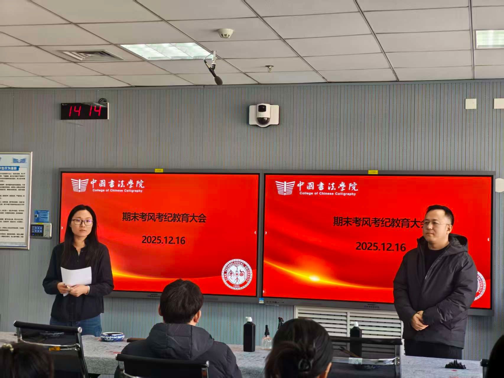 为营造风清气正的考试环境,引导学生秉持诚信考试理念,中国书法学院于12月16日组织召开了期末考纪考风教育大会。本科生辅导员黄星光及全体学生参加,会议由研究生辅导员王小利主持。